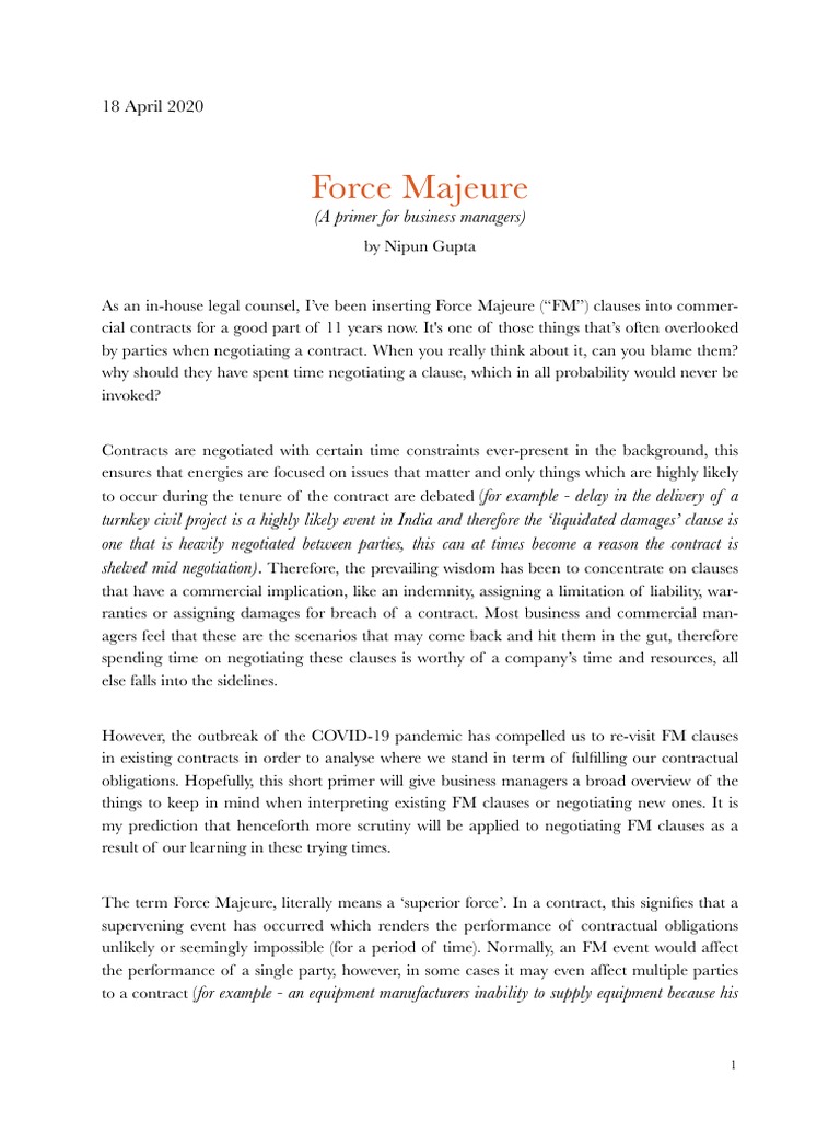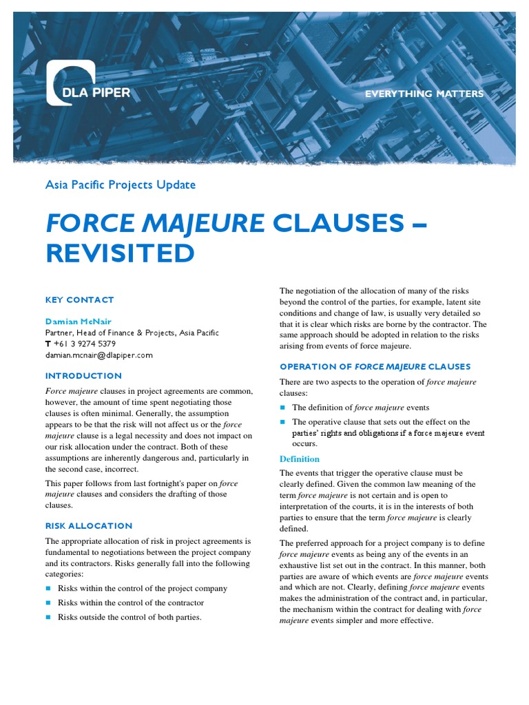 Force Majeure Example : Https Www Hoganlovells Com Media Hogan Lovells Pdf 2020 Pdfs 2020 03 27 Covid 19 Pandemic And Force Majeure Clauses Pdf : A force majeure clause is a section of a contract that relieves a person or company of their force majeure clauses can come into practice in the event of an earthquake or flood, for example.